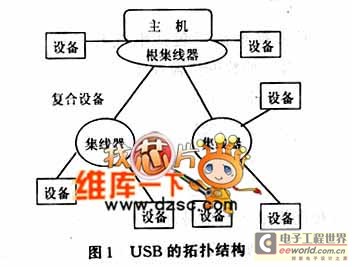 HUB用来扩展接口,以使系统连接更多的外设。他可以被集成到一个设备内部,如键盘和显示器(称为复合设备),或者作为一个单独的设备实现,如图1所示。在即插即用的USB结构体系中,集线器是一种重要设备,如图2所示。