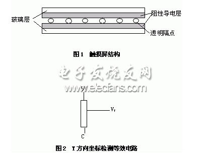 电阻触摸屏是一多层的复合膜,由一层玻璃或有机玻璃作为基层,表面涂有一层透明的导电层,上面再盖有一层塑料层,它的内表面也涂有一层透明的导电层,在两层导电层之间有许多细小的透明隔离点把它们隔开绝缘,如图1。当手指触摸屏幕时,平常绝缘的两层导电层在触摸点位置就有了一个接触,控制器检测到这个接触后,其中一面导电层接通Y轴方向的5V均匀电压场,另一导电层将接触点的电压引至控制器进行A/D转换,得到电压值后与5V相比即可得触摸点的Y轴坐标,如图2。同理得出X轴的坐标。这是所有电阻触摸屏共同的基本原理。