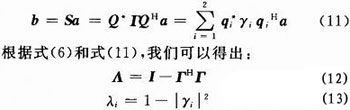 式中:A=diag{λ1,λ2},而Q是幺正的(即QQH=I)。根据厄米特矩阵的性质,两个正交值λ1和λ2都是实数,并且小于等于1。将式(5)代入式(4)得: