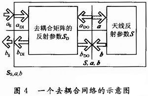为了使正交模式的辐射效率最大,文献和文献详细论述了等效耦合参数的方法。对于一个双天线系统,等效去耦合网络如图4所示,其中S是天线的反射参数,SD是去耦合网络的反射参数,文献指出加入了去耦合系统的S参数可以表示为: