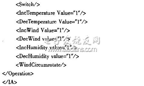 通过XML对家电设备接口进行了简单的定义,其头节点为IA,IA节点下包括4个子节点,分别表示设备名、设备属性、设备状态、设备操作集。这4个节点是固定的,但是这些节点之下包含些什么节点,就会因为家电设备的不同,家电生产商的不同而不同。如: