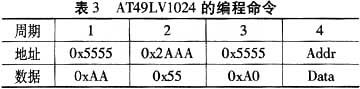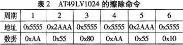 Flash的数据可直接读取,但对Flash的编程和擦除操作则需要通过一系列命令才能进行。AT49LV1024的写操作只能将1变成0,而0变成1必须通过擦除操作进行。所以每次写Flash之前必须进行片擦除,使存储单元值变成0xFFFF,才能进行编程。