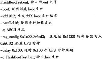 若要生成引导表,可用CCS最终编译生成的,out文件通过CCS自带的hex55.exe转换程序得到。将hex55.exe、.out文件、.0cmd文件放在同一个文件夹中,通过DOS命令调用hex55.exe。即可完成.out文件到hex格式的引导表文件的转化。.CMD文件用于提供引导表的相关配置信息,以下为一个.CMD文件的实例: