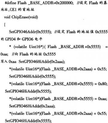 根据Flash的编程和擦除命令,编写了相应的C语言程序,其中SetGPIO46Addr(Addr)子程序的作用是根据所传递的Addr值配置相应的GPIO4和GPIO6即高两位地址的值。