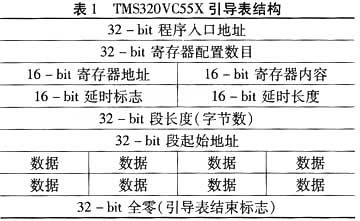 Bootloader在引导程序时,程序代码是以引导表格形式加载的。TMS320VC55x的引导表结构中包括了用户程序的代码段和数据段以及相应段在内存中的指定存储位置,此外还包括了程序人口地址、部分寄存器的配置值、可编程延时时间等信息。TMS320VC55x系列DSP的引导表结构如表1所示。