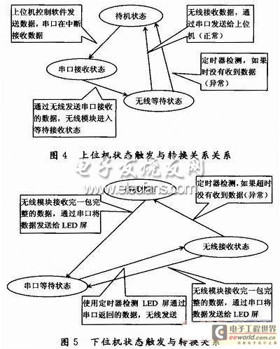 上位机在中断中接收PC机发送的控制数据,存储在循环链表中,通过无线芯片分包发送;上位机查询无线芯片接收回复数据,通过串口发给PC机上的控制软件;上位机状态触发与转换关系如图4所示。下位机查询接收无线模块发送的数据,通过串口转发给LED屏控制卡;LED屏控制卡的回复数据,下位机在中断中接收,通过无线发送;下位机状态触发与转换关系如图5所示。图4和图5共同完成1次数据应答。