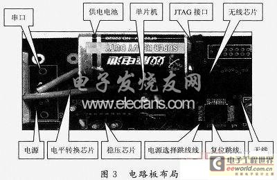 采用芯片LM1117将DC 9 V稳压到DC 3.3 V,对单片机ATmega16A、芯片nRF905、芯片MAX3232进行供电。串口通信采用芯片MAX3232进行逻辑电平的转换。系统采用高性能、低功耗的8位AVR微处理器ATmega16A单片机。该单片机具有16 KB的系统内可编程FLASH、512 B的E2PROM和1 KB的SRAM,供嵌入式软件使用;在线调试的JTAG端口,丰富了系统的调试手段;独立的定时器和可编程的串口,加强了系统的功能。单片机ATmega16A上的SPI接口,可保证无线芯片nRF905的无缝连接。