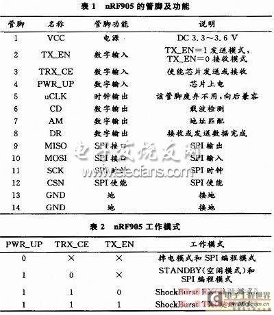 (1)芯片nRF905的管脚及管脚功能如表1所示。
