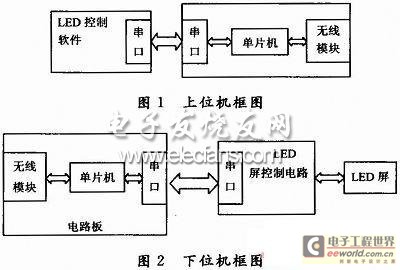 硬件框图如图1和图2所示。图1为上位机框图,电路板上的单片机收到计算机发来的控制数据,通过无线模块转发。图2为下位机框图,单片机将无线模块收到的数据,通过串口发给LED屏的电路控制板。LED屏回复数据的传输方向正好相反。