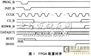 FPGA加载时序如图1所示。各配置信号必须满足其时序关系,否则配置工作无法正常完成。