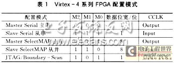 Virtex-4系列的FPGA芯片外部配置引脚MODE PIN(M0、M1、M2),有5种配置模式,如表1所列。