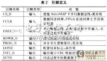 FPGA在Slave SelectMAP方式下,共用了表2所列的15个配置引脚。