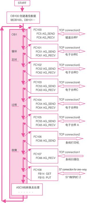s7-300 plc基于开放通讯的cp343-1模板连接组态不需要编程,而是通过netpro来组建的,因此其通讯编程只需调用面向连接的send/receive接口就可完成ascii数据收发工作,系统的s7 plc共有八个tcp连接,其中电子台秤共有6套分别占有6个连接,台秤通信过程是双向应答式的,在每一个连接中完成ascii码数据的读和写功能,s7-300整个通信功能流程如图4所示。