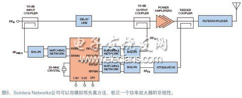 尽管手机基站制造商接受数字系统,但供应商们在采样数据系统中做的主要是模拟电路,这带来了成本、功耗和空间不利因素。替代方法是用模拟技术实现RF放大器的线性。例如,新兴公司Scintera Networks将目标瞄准了5W区间的小功率RF系统,还有UHF(超高频)电视发射站的信号路径(图8)。这种方法会采样驱动级的RF信号,使RF信号保持在模拟域中,但通过采用一种波形的Volterra Series扩展,对其作因数修正。Volterra Series是一种非线性性能的模型,类似于Taylor Series,不过Volterra Series可以表达记忆效应。Scintera公司的方案会对RF输出作采样和数字化,采样结果被送入该公司芯片中的数字电路。该设计用数字段计算出RF信号链的模拟因数,然后用另一个单向耦合器,将经Volterra因数修正的RF信号混合回到RF路径中。系统只需要在芯片中处理足够的RF,就能校正放大器的失真。大多数RF功率都在主RF路径内,而绕过了IC。Scintera公司将RF保持在模拟域,提供了一个功耗远低于数字预失真方式的系统(图9)。