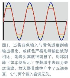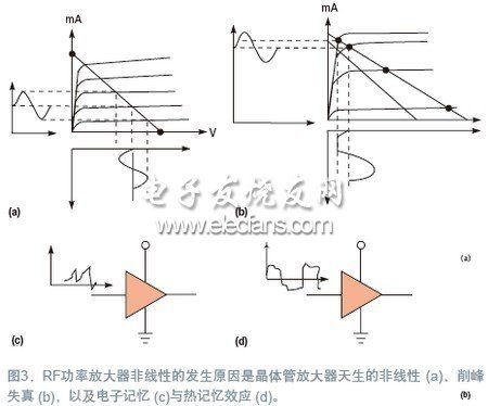 在频域和时域中都可以查看RF放大器的失真。在时域中,能够形象地看到一个通过RF放大器的切角或平顶正弦波,如同驱动过度而靠近电压轨的音频信号一样(图1)。在频域中,放大器失真表现为包含谐波的“边缘”,它进入了邻近频段范围内(图2)。对于任何放大器,希望的功率越高,则得到的失真就越严重。在RF频率下,不仅有幅度失真,还有相位失真,以及由于热瞬变和电记忆效应所带来的失真(图3)。相位失真出现于快速转换速率区中,RF输出滞后于输入信号的情况,如当载波信号进入大地时,或当一个调制包络必须立即变到一个不同电平时。