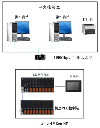 系统主要以北京和利时公司LK系列PLC为核心、执行机构、声控报警、仪表系统等组成,主要控制26个不同储罐的温度、液位、流量等,还包括13台泵及9台开关阀的控制,所有储罐均设置液位高低限报警、温度报警、流量控制。在中央控制室设置操作员站和工程师站,并联网至总控室,方便人员对整厂的系统监控与管理,硬件结构示意图如图3-1所示。