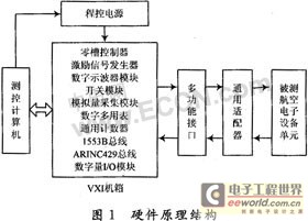 测试系统的核心是测控计算机,与软件一起完成对VXI机箱中测试仪器的控制和管理,完成测试数据采集、分析以及故障诊断VXI机箱中测试仪器产生航空电子设备各部件所需要的激励信号,并接收被测部件的响应信号,对这些信号进行调理,进而检查和测试,达到故障定位的目的多功能接口和通用适配器将被测部件和VXI机箱完成电气连接部件,在测控计算机的控制下,根据测试需求,完成激励信号和响应信号传输