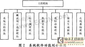 自动测试软件功能包括主控模块、系统自检模块、测试项目选择模块、信号处理模块、数据采集模块、故障诊断模块、报表打印模块、在线帮助模块主控模块主要完成各功能模块的监控与管理,在运行过程中若出现异常情况,能够给出退出指示,便于用户中途退出系统自检模块主要对测试系统本身的工作状态进行检查,以判别系统能否正常工作,便于用户使用与维护测试项目选择模块用来选择所要测试项目内容
