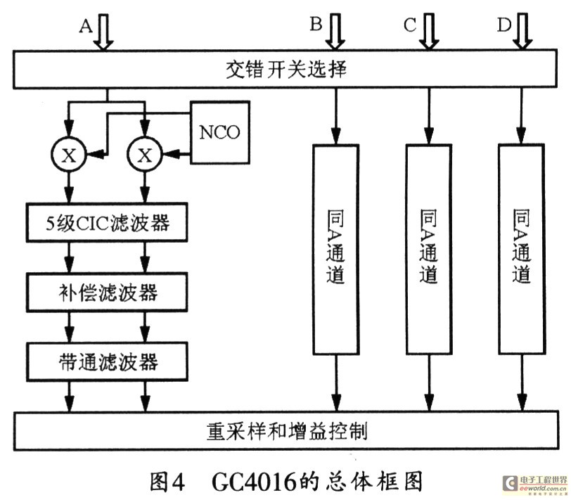 GC4016是Graychip公司推出的专门用于数字下变频的芯片,该芯片内置4个独立的相同下变频电路,它可将一个高达90 MHz的实采样信号下变频到任意频率,其内部的抽取滤波器还可以将输出速率降到采样速率的l/32倍到1/16384倍。GC4016的总体框图如图4所示。图4中的交错开关用于控制输入数据与下变频通道的对应关系。