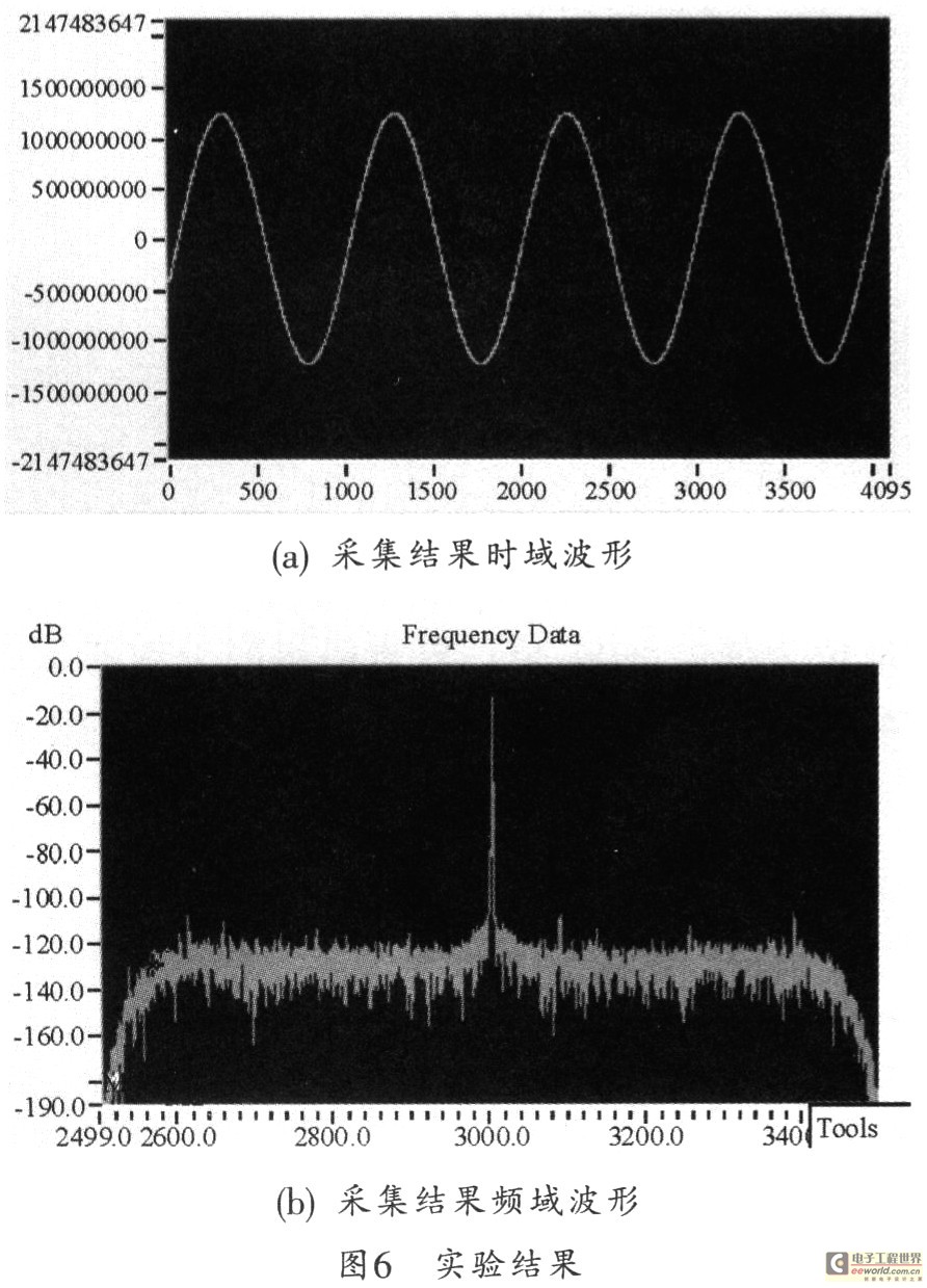 本系统密集度高,芯片多为BGA封装,故在布局时应注意将数字部分和模拟部分尽量分开,以避免数字电路通过线间分布电容对模拟电路产生干扰。另外,在应用场所周围,如存在强干扰电磁场,还应在模拟电路部分加屏蔽措施。图6所示是用100 MHz内部时钟来对频率为3MHz的正弦信号进行采样,同时设置DDC本振频率为2.999 MHz,5阶差分梳妆滤波器抽取因子为25 (即总抽取因子为25x2x2=100)所获得的波形及频谱图。