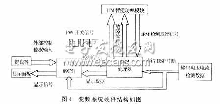 根据上述设计,使用IPM(智能功率模块)及相应的整流,滤波电路搭建了一变频实验系统。出于扩展的要求,使用单片机扩展了其的输入输出接口,使其具有更好的通用性。其硬件结构如图4所示。