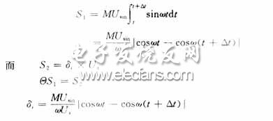 在图中的正弦半波波形中取一小区间[t,t+Δt],其面积为S1,则与其面积相等的矩形脉冲面积为S2,宽度为δi。设正弦波幅值为Usin,调制度为M,矩形脉冲幅值为Us。有