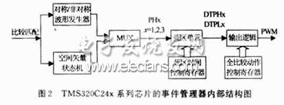 C2000系列中的C24x系列的芯片具有事件管理器。该事件管理器具有3个加/减定时器和9个比较器,可以和波形产生逻辑配合产生12 PWM的输出。支持同步的和异步的PWM产生。他还支持一个空间向量PWM状态机,用开关功率晶体管来实现,以延长晶体管的寿命和降低功耗。一个关机段产生单元也有助于保护功率晶体管。其原理如图2所示。