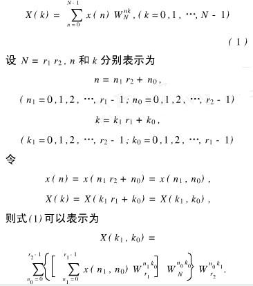 式(2)表明,计算组合数N=r1 r2点DFT等价于先求出r2组r1点的DFT,其结果乘以旋转因子后,再计算r1组r2点的DFT.