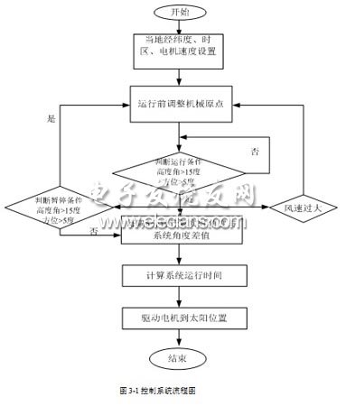 通过程序控制,可以自动判断是否满足运行条件从而达到自动启动运行装置、自动停止、返回初始状态等控制。增加风力传感器用于对系统的保护作用,当风力大于一定数值时,系统停止工作,复位到原点,风速满足工作条件时,系统自动开始工作。太阳能电池板有两个自由度,控制机构对高度角和方位角两个方向进行调整。当电池板转到尽头时,由于跟踪装置装了限位传感器,到限位触点时自动切断输出,电机停止工作。