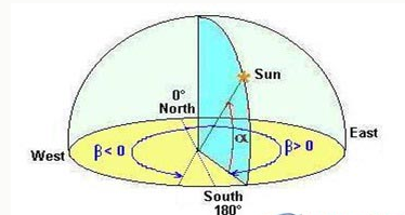 太阳在天空中的位置可以由太阳高度角和太阳方位角来确定。太阳高度角又称太阳高度、太阳俯仰角,是指太阳光线与地表水平面得之间的夹角。太阳方位角即太阳所在的方位,是指太阳光线在地平面上的投影与当地子午线的夹角,可以近似看作是树立在地面上的直线在阳光下的阴影与正南方向的夹角。太阳方位角和高度角的实时数值可以通过地理经纬度、时区参数利用公式计算出来。