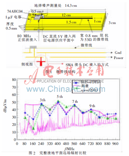 首先在四层PCB板中进行完整接地平面的仿真和测量[6],实验板结构如图1所示。四层PCB板是相对介电系数(εr)为4.3的FR4的结构,微带线长12.5 cm,输入信号接入方式为振幅2.5 V并具有2.5 V直流偏压的正弦波。为了避免连接器的不连续结构造成辐射影响测量的精确度,使用同轴线将直流电源接入差分SMA连接器;为了控制输入信号对输出端信号的干扰,输入线设计得很短(1.5 cm)。采用泰克公司数字实时示波器TDS684C接上P6243有源探头(1 G)测量时域上的波形。经实验测量由于在IC电压端有去耦合电容稳压再加上完整接地平面的隔绝所以几乎没有地弹的现象,电源平面层上的信号也无周期的现象。图2为EMI的远场辐射测量对比结果,经speed2000模拟发现电源平面层(2D-FDTD)并无辐射,主要部分的辐射来自于信号层(由公式计算)而非地弹造成的,这与实际测量的结果比较吻合。同时也显出在接地面完整结构中,采用时域有限差分法结合IBIS模型仿真与采用speed2000软件仿真具有高度的一致性。