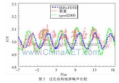 图6为远端的仿真波形比较,如同跨越狭缝的微带线,由于整条信号线的阻抗分布不均匀造成远端波形也有一些不平整,但由于过孔(via)穿越的长度(1.5 mm)造成的阻抗不连续段并不如狭缝(26 mm)那么长,所以在信号的扰动上并不像狭缝结构的扰动那么剧烈,但比完整接地平面来说扰动量还是比较大。而透过过孔(via)在电源平面所造成的地弹却很明显地比狭缝上的大,如图7所示,主要是由于狭缝的耦合量主要来自于狭缝两端的压差并不会直接影响整个电源供应平面的场量。运用有限时域插分法分析IBIS模型的仿真结果与speed2000的仿真结果一致,同样发现此种结构中电源平面层(2D-FDTD)所造成的辐射远大于信号层所产生的辐射,显示出此结构主要的辐射来自电源供应平面的扰动。