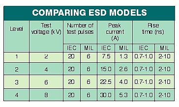 但是,明显的瞬间电压威胁和能量等级的不同存在于两个模型之中。于是设计工程师可以使测试过程适合他们所期望的具体应用。例如,IEC1000-4-2具有一个非常快速的电平脉冲上升时间,能应用更多的脉冲和更高的峰值电流(见表格)。