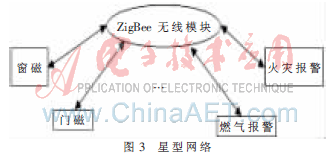 内网由PC 机和ZigBee无线数据通信模块组成,它们之间通过串口连接。ZigBee网络由协调器、路由器和终端设备三部分组成。协调器和路由器称为全功能设备FFD,终端设备称为精简功能设备RFD。由于该系统设备比较简单,采用星型组网方式,将窗磁、门磁等看作终端设备,ZigBee无线模块为协调器,该系统结构简单,所以不需要路由器。如图3所示。