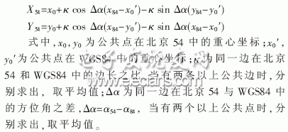 首先,根据公共点分别在WGS84和北京54系中的高斯平面坐标,求出该点在两个坐标系中同一边的方位角之差?驻?琢和长度比例系数?资,然后按下式计算任一点在北京54系中的平面坐标。