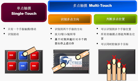 图3显示了Cypress TrueTouch方案的不同应用领域,包括触摸按键,图像的两手指手势操作,以及同时识别多点触摸位置和控制多个目标。