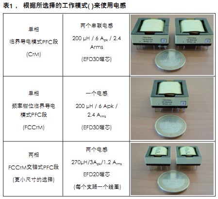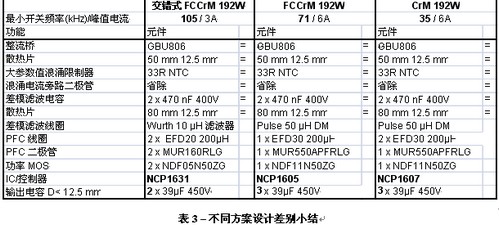 不同的方案中,电感并不必然是唯一需要修改的元件。PFC段必须根据所测试的方案来调整。表2小结了构建这三种方案使用的经过了实际测试验证的主要设计指引。