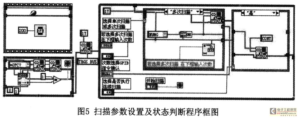 当点击了该按钮后,由于大量GPIB口写入的SCPI命令需要一定的时间来完成,同时还需考虑Labview程序本身存在的延时,我们必须保证在进行后续操作之前,这些写入的命令已执行完毕。对于输入命令是否完成,我们需要对SRQ中的只读状态寄存器层进行访问,并读取相应位置的状态,当该位的返回值为l的时候,则证明数据写入完毕,可以执行下步操作。这一过程相应的程序框图如图5所示。