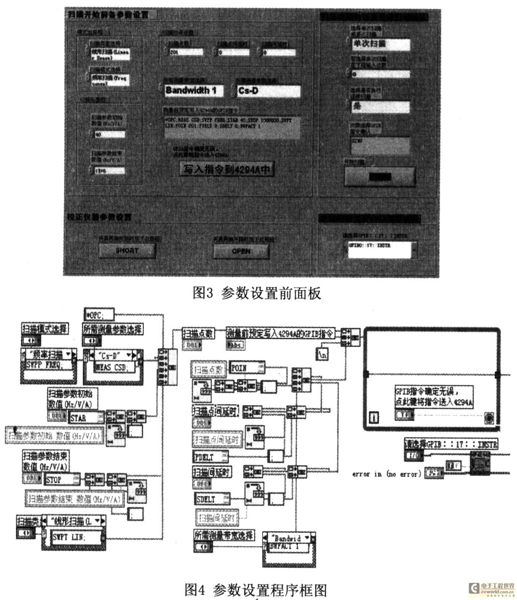 对于4294A的自动控制首先要实现对其面板参数的程序化控制,因此需要构建一个虚拟前面板来模拟仪器的控制面板,同时在程序设计部分妻实现对各个参数的设定和调整。参数设置虚拟前面板及其对应的程序框图如图3和4所示。