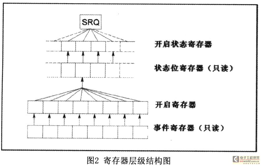 需要利用Labview来完美实现Agi lent 4294A的各个功能。利用GPIB口可以将PC同4294A连接起来,并利用SCPI(Standard Commands for Programmable Instruments)指令来对仪器进行状态查询和程序控制。4294A拥有储存仪器状态的一套完整的状态寄存器。因此通过调用查询寄存器不同位的数值就可以判断测量参数设定是否完毕,扫描是否启动或停止,以及数据是否读入。4294A的寄存器结构是一个典型的层级结构,如图2所示。通过对事件寄存器以及状态位寄存器相应位的查询即可知道仪器详细的操作状态。
