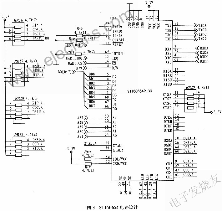 为O,但实际波特率要通过MCRBIT7初始化设置,各路传输速率最高可达921.6 Kb/s。STl6C654电路设计如图3所示。