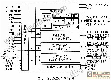 STl6C654是一个带有收发各64 Byte的FIF0的扩展通用异步收发器,自动软硬件流程控制,速率最高达到1.5 Mb/s(24 MHz时钟),支持16(Intel)/68(Motorola)总线接口类型。STl6C654结构图如图2所示。扩展的4路串口通道,每个通道有15个(64/68pin封装)或16个(100pin封装)内部寄存器,用来存放收发数据以及配置该串口的工作模式,需要在初始化时对各寄存器进行配置。工作模式有中断模式和定时查询模式,中断模式实时性能好,适合于紧急情况,中断次数多,中断任务切换频繁影响主要任务的运行;定时查询模式,由于STl6C654具有缓存,定时查询方式具备一般实时性,数据不丢失。