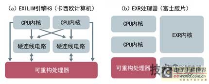 图中列出了卡西欧计算机及富士胶片分别公开的图像处理LSI的内部构成(a、b)。相似点是都具备两个CPU内核。
