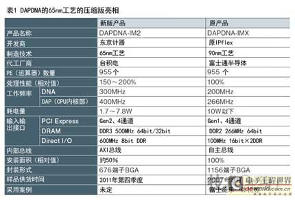 新版芯片在保持运算器数量与原产品同为1000个左右的同时,将制造技术从90nm工艺微细化到了65nm工艺,降低了制造成本,有望培育成赢利业务。与原产品相比,虽然运算器数量一样,但工作频率提高到了约1.5倍,性能更高。