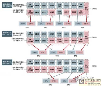 图中列出了微波数字电视发送设备的设计优化过程。在最初试行时使用4块芯片的STP引擎,但最终优化为了两块芯片的构成。(图片源自瑞萨电子)