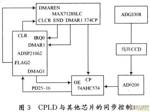 END信号每11 ms产生一个负脉冲作为DSP的外部中断请求信号,低电平有效。CLR信号由DSP产生,作为清零信号,当CLR为低时,则不产生CCD与AD9200的驱动时钟。PCLK是DSP的时钟,与CPLD的输入时钟信号同频,这里PCLK由CPLD产生而不是直接由晶振送入DSP是为了保证整个电路系统在统一的时钟下工作。ADSP21062与74AHC574之间采用DMA握手方式读取数据。74AHC574的CP与OE必须严格进行设置,否则采样数值将有时候发生紊乱。74AHC574的CP信号由CPLD产生,CP滞后DATACLK,在数据有效期内CP上升沿将数据锁存至74AHC574。DMAR1信号由CPLD产生,ADSP21062响应该外部中断请求DMAR1后输出DMAG1信号作为74AHC574的输出使能信号OE,从而以握手方式将数据送到ADSP21062的外部总线上。DSP用FLAG2产生DMAREN以控制DMAR1请求,方便ADSP2106在做数据处理时关断外部中断,防止由其产生的更改内部RAM数据的误操作。