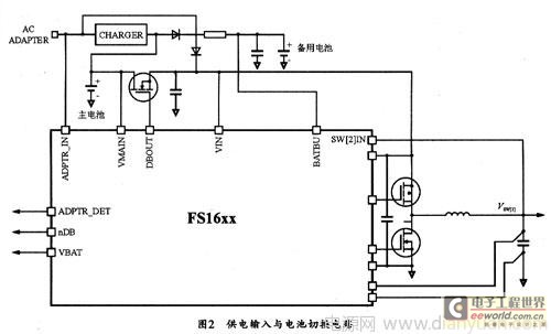 FSl610的供电电压范围是2.8~5.5 v。图2所示是S1610的供电输人以及AC适配器和电池之间的切换电路。其中VMAIN为主电池比较器输入,用来直接监测电池的状态;VIN为主电源供电输入;DBOUT用于断开电池的输出,将它连接到一个外部的P通道MOSFET,可当检测到电池的无电状态(DB)或者AC适配器有输入时,由该输出置位断开电池和主电源的连接;BATBU为备用电池输人,一般情况下,为了能使芯片正常操作,在BATBU输入引脚上一定要有电压;VBAT为始终开启的供电输出,可由内部开关控制,当SW[2]有效且稳定时,可将SW[2]连接到VBAT来提供电压;否则由BATBU给VBAT提供电压。