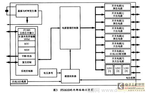 图3是FSl610模块的内部结构示意图。由图可见,FSl610以电源管理控制器为核心,可为外部设备提供丰富的电源通道。另外,配合电源管理.FSl610还提供有非易失性存储器NVM、实时时钟RTC、看门狗定时器WDT、中断、复位等系统控制模块。