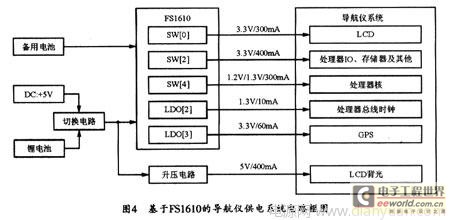 由于该导航仪通常是采用电池供电,故需要最小化的功率消耗,而且要求各外设都要由系统控制。在图4中用FSl610对导航仪系统进行供电的电源分配方案中,需要注意的是,LCD背光需要400mA电流的+5v供电,而FSl610的升压电路不能提供这么大的电流,因此,设计时应用一个外加的升压电路来提供LCD的背光电源。