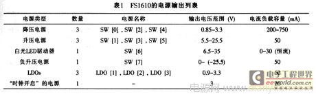 IS1610内部的电压检测主要针对的是FSl610芯片的供电输入,而器件的输出则包括8个高效开关电源和3个低功耗LDO,表l所列是其电源输出列表。需要注意的是,FSl610的输出电压和电流都会受到输入电压、电感、电容以及外部诸多元件因素的影响。